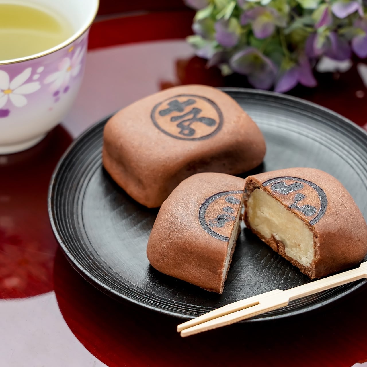 味は洋風、ホワイトチョコ餡をココア生地で仕上げました。